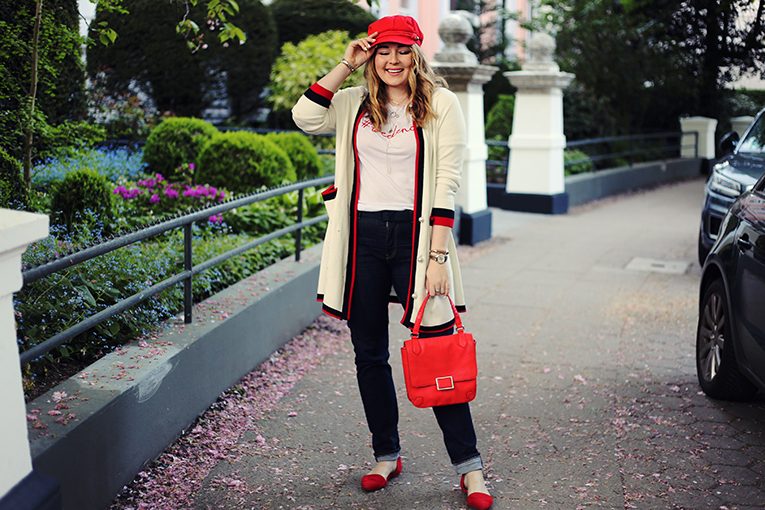 Meine Lösung ist ein gemütliches Shirt, eine locker sitzende Jeans, flache Schuhe und ein langer Cardigan oder eine leichte Jacke. Aufwerten kann man das Outfit ganz einfach mit Accessoires wie zum Beispiel einer Baker Boy bzw. Schiffermütze oder auch mit Statementfarben.