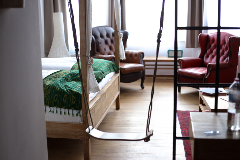 Himmelbett, Schaukel, große Fenster und gemütliche Elemente, die dem Zimmer Wärme verleihen. Die Möbel sind aus Holz (meist naturbelassen), die Lampen und Teppiche könnten Mitbringsel aus Bali sein.
