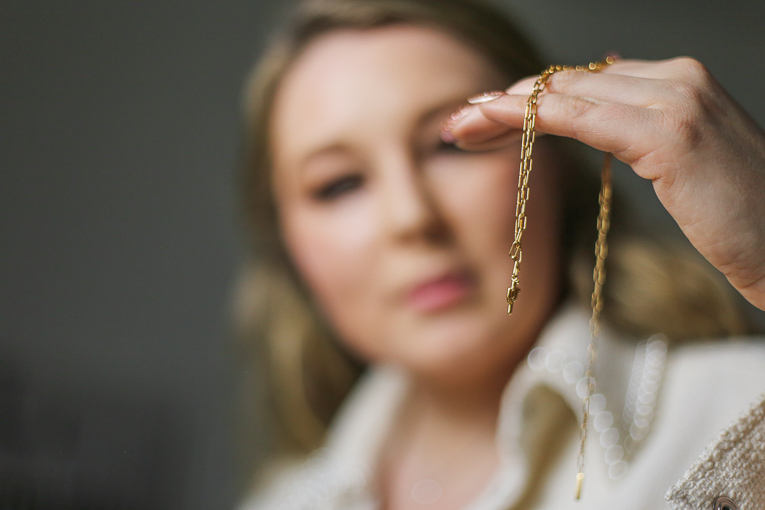 Richtig gelesen! Bei den Gliederketten musst du dich nicht auf eine Länge festlegen. Die meisten der Gliederketten können in verschieden Längen getragen werden. Mein Styling Tipp: Kette in Choker Länge einhaken, den Verschluss nach vorne drehen und das lose Ende einfach vorne baumeln lassen.