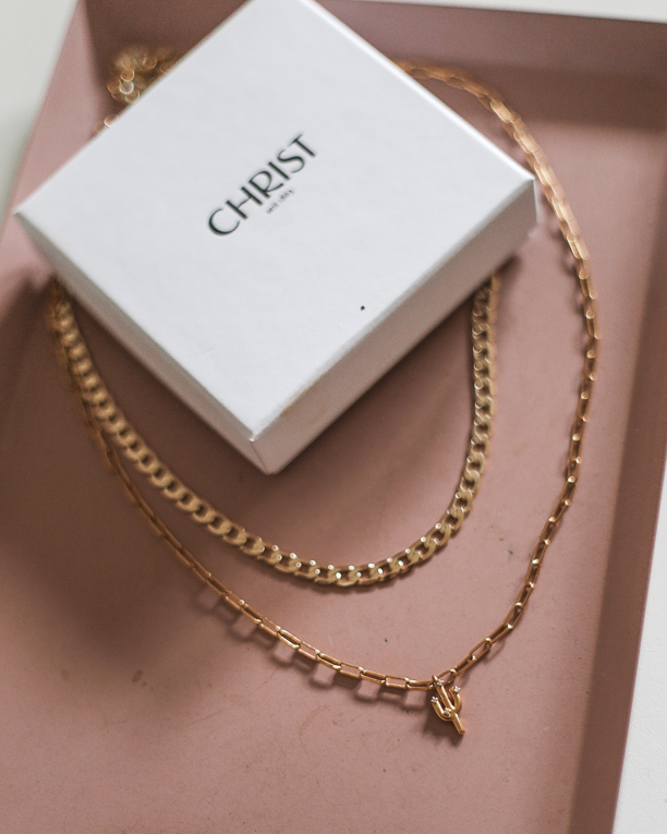 Du hast noch lauter filigranen Schmuck zu Hause? Versuche dich mal die Ketten mit einer Gliederkette zu kombinieren. Ich trage zu meiner Gliederkette eine weitere Kette von Christ. Es handelt sich um zarte bicolor Kette mit einem Zirkonia Steinchen.