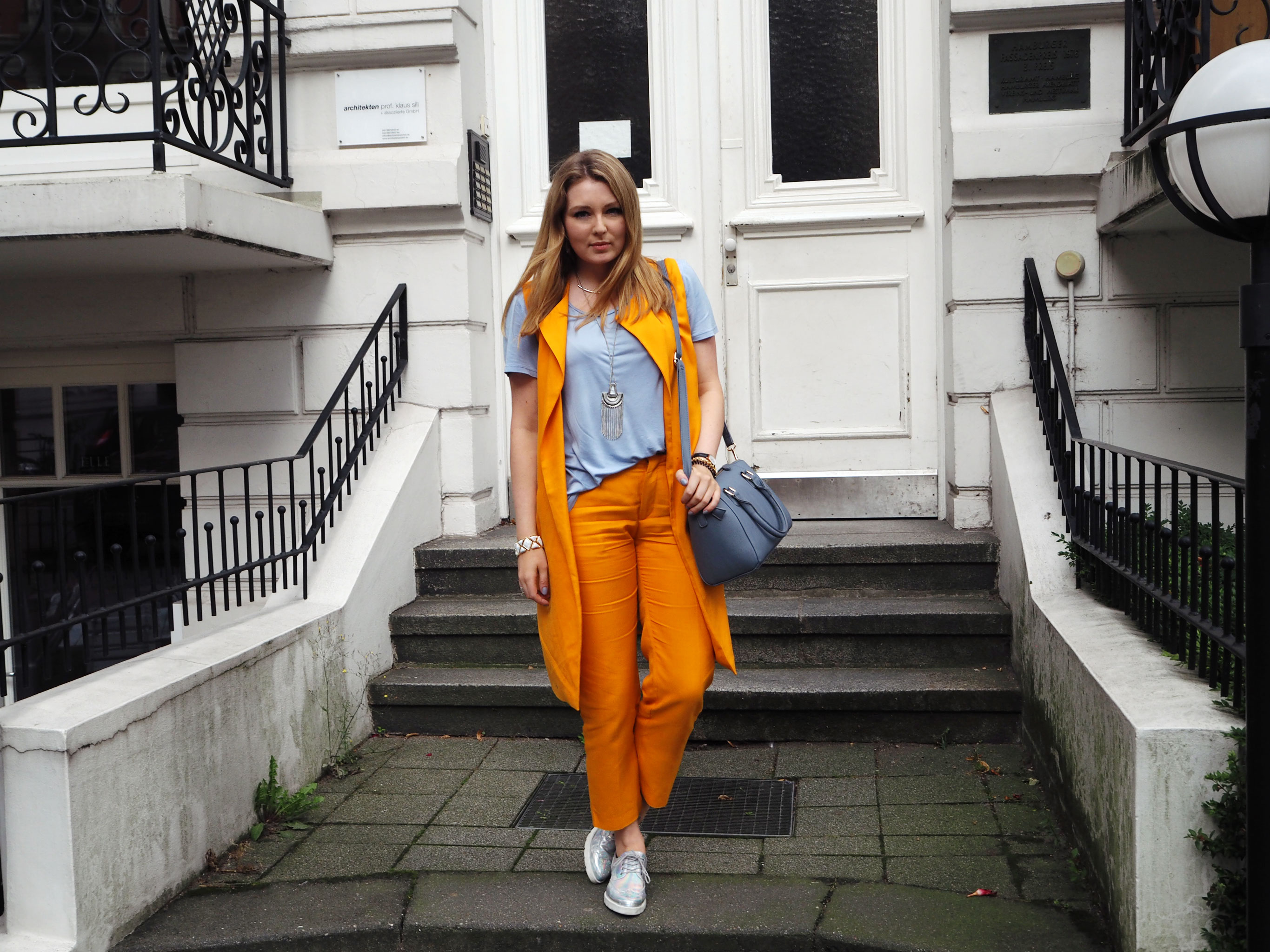 Orange outfit with blue details